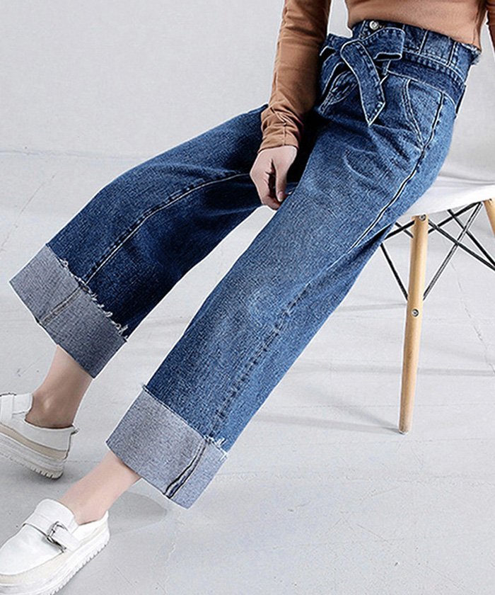 セール ロールアップ デニムパンツ レディース ハイウエスト ゆったり ガウチョパンツ ウエストリボン付き ワイドパンツ ミニミニストア Miniministore Magaseek